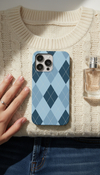 Phone case with blue and navy argyle pattern on a white background