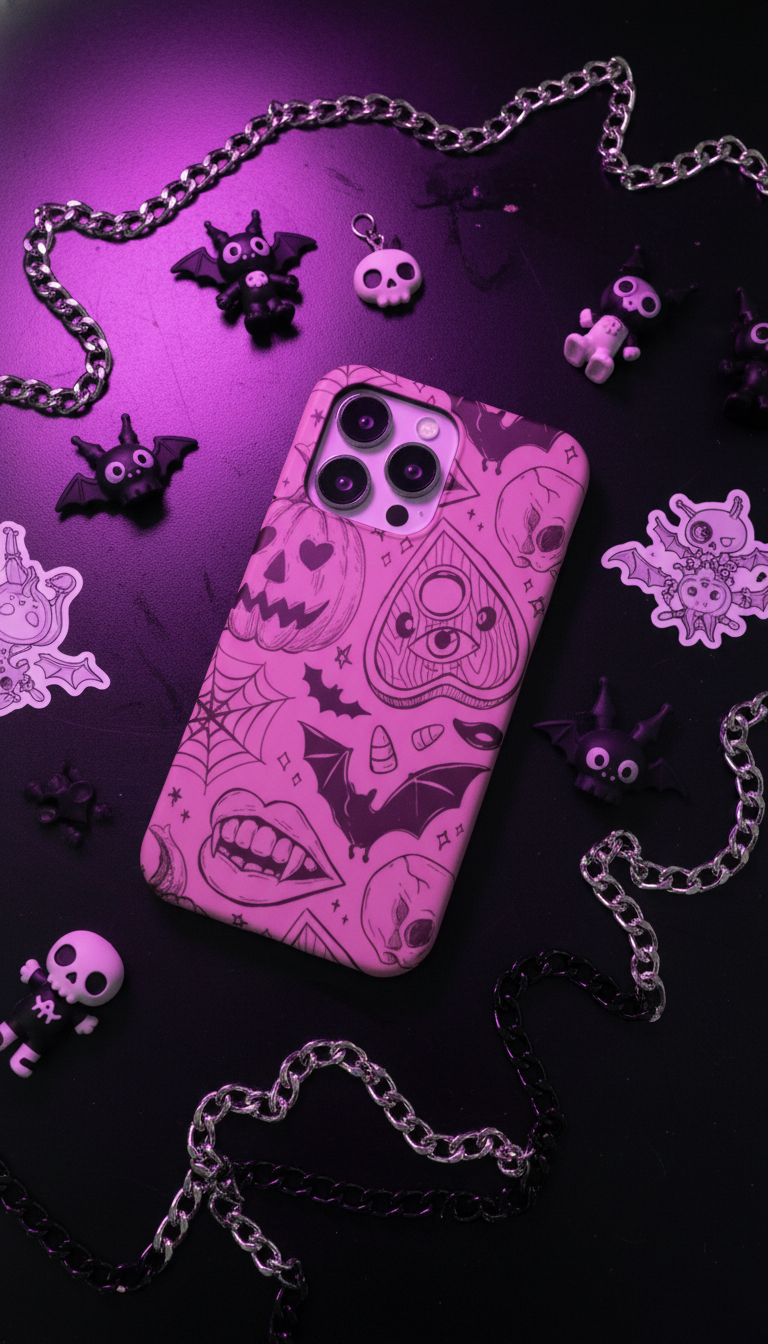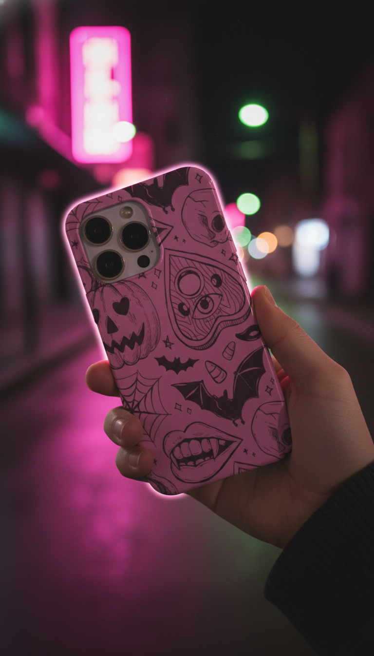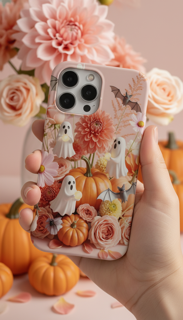 Phone case with Halloween-themed design featuring pumpkins, ghosts, and flowers on a white background.