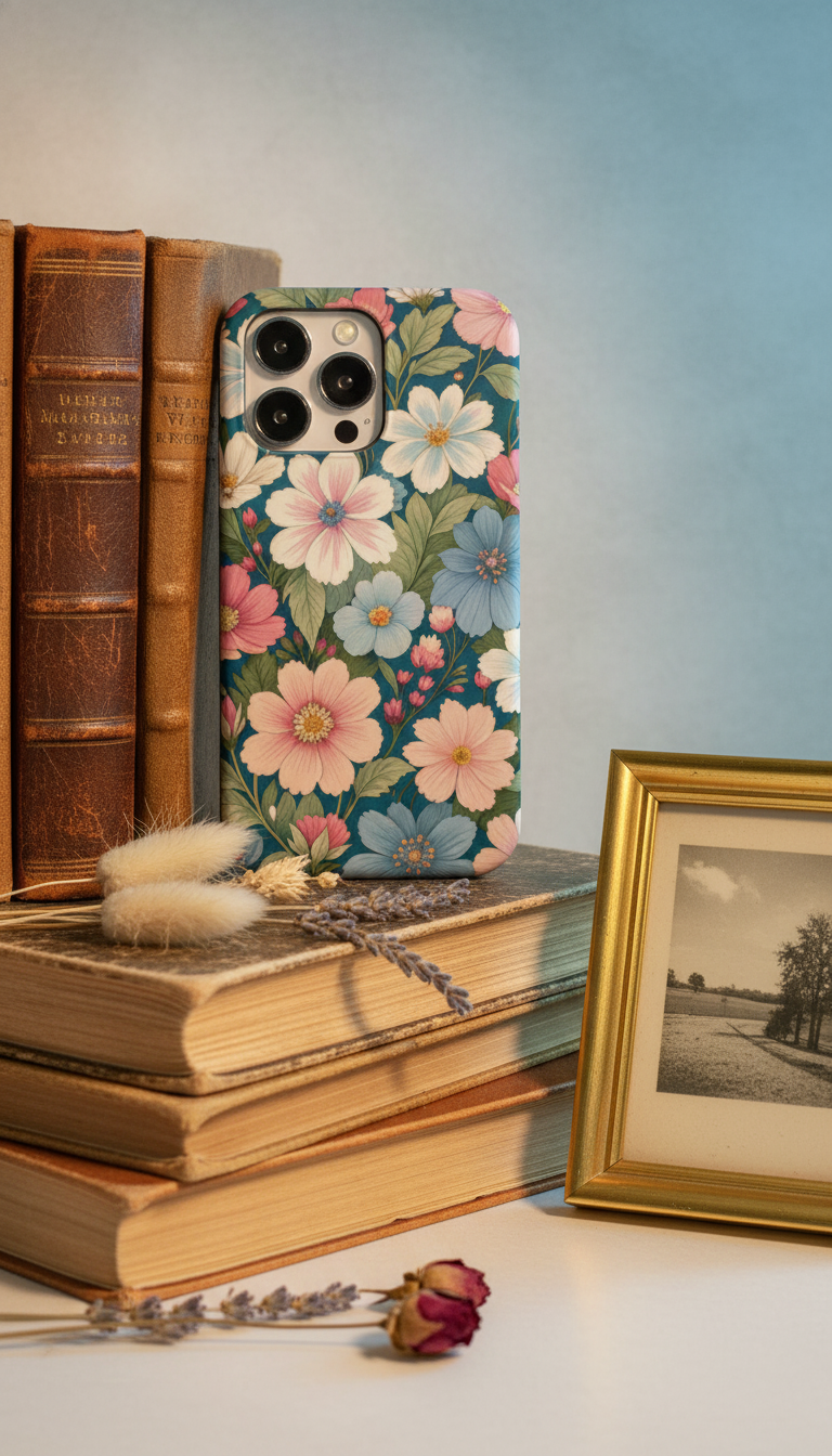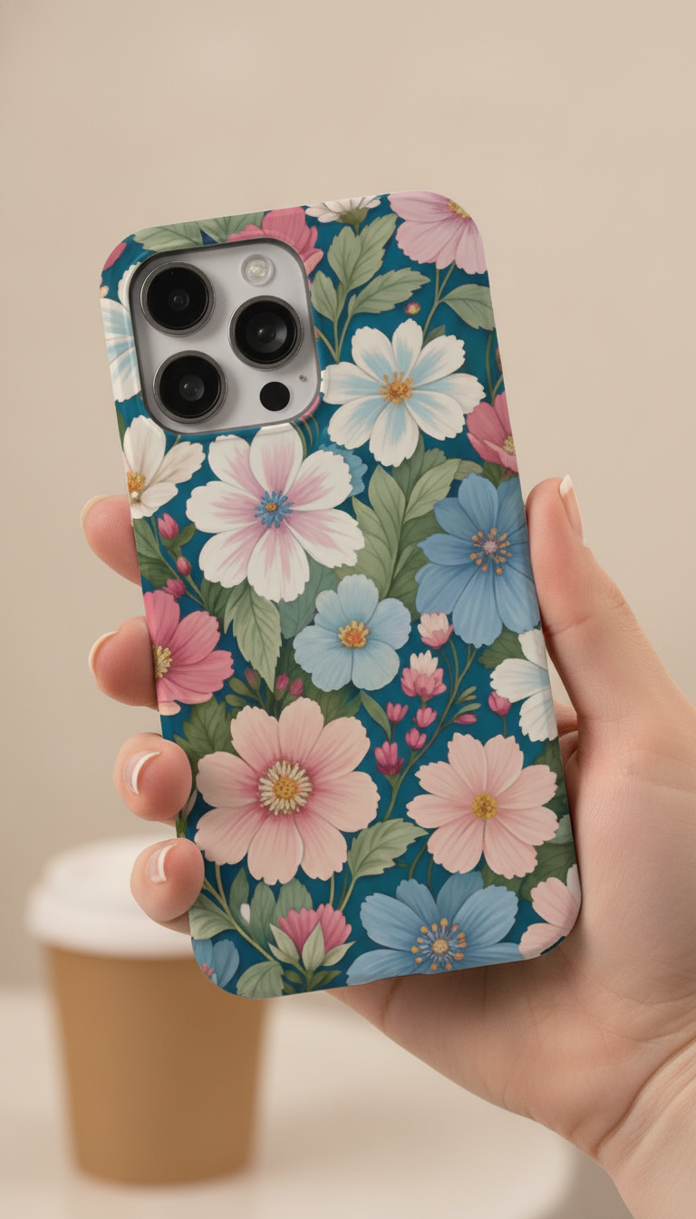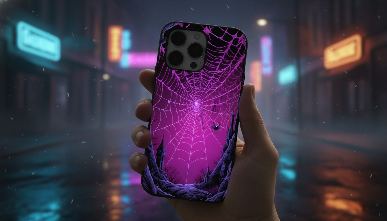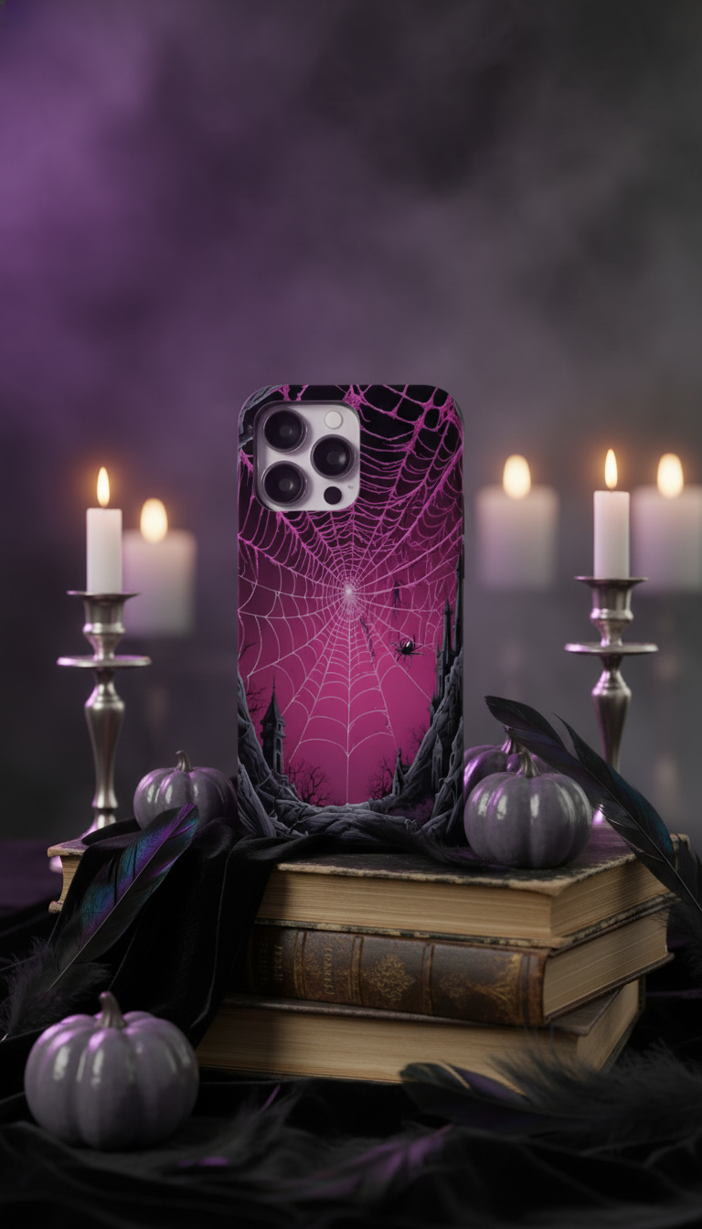 Phone case with Halloween-themed design featuring pumpkins, ghosts, and flowers on a white background.