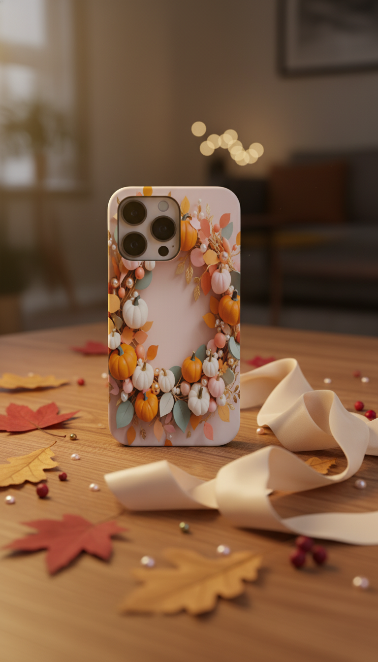 Phone case with autumn-themed design featuring pumpkins and leaves on a white background
