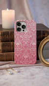 Pink phone case with white floral pattern and text 'Easy access to phone ports' on a white background