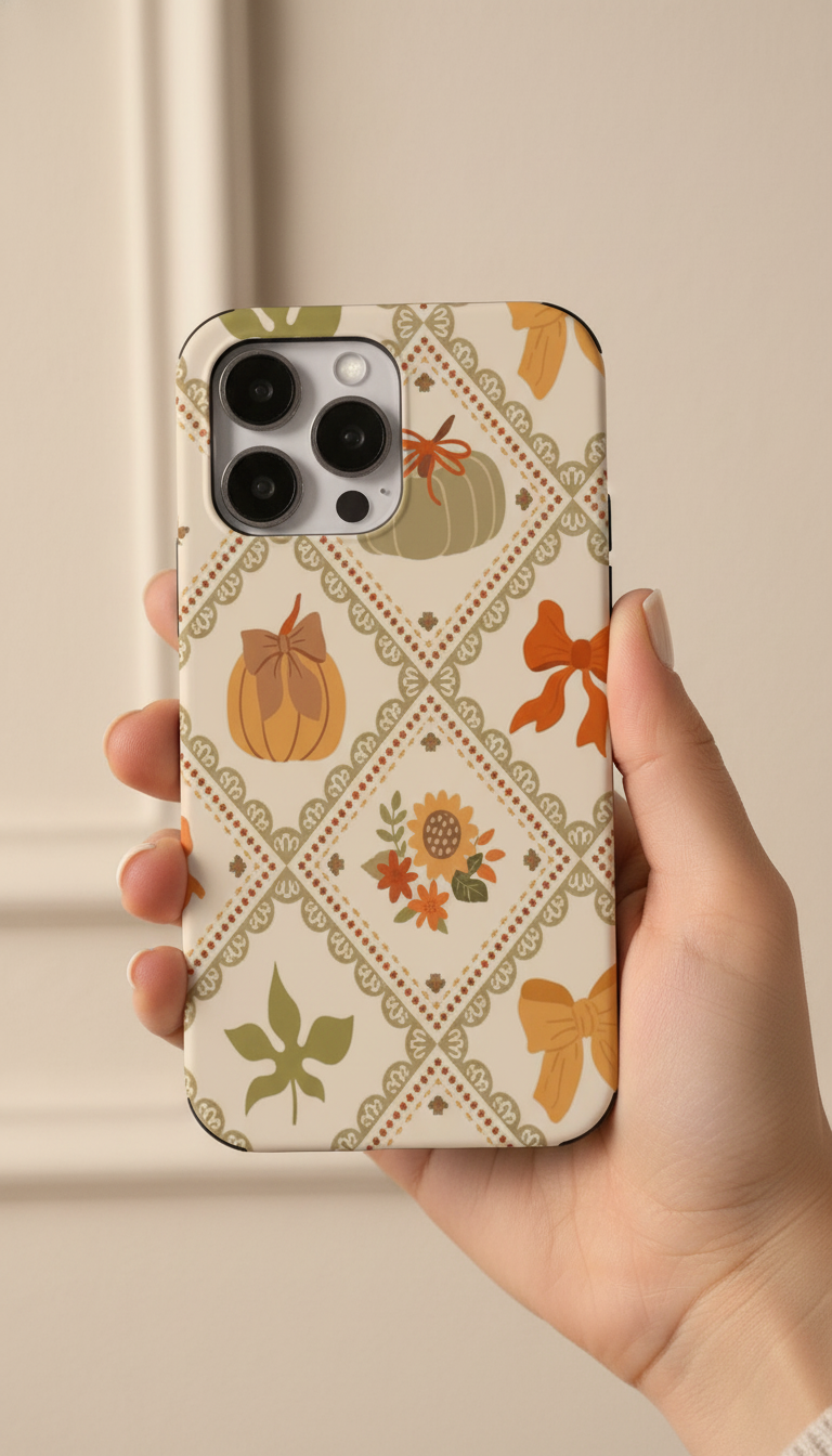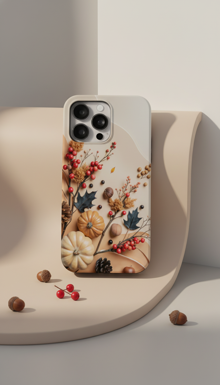Phone case with autumn design featuring pumpkins, leaves, and berries on a beige background