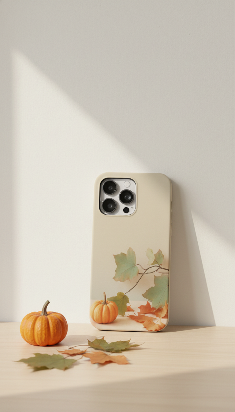 Phone case with autumn design featuring leaves and a pumpkin on a beige background