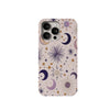 Phone case with celestial design featuring moons, stars, and suns on a light background